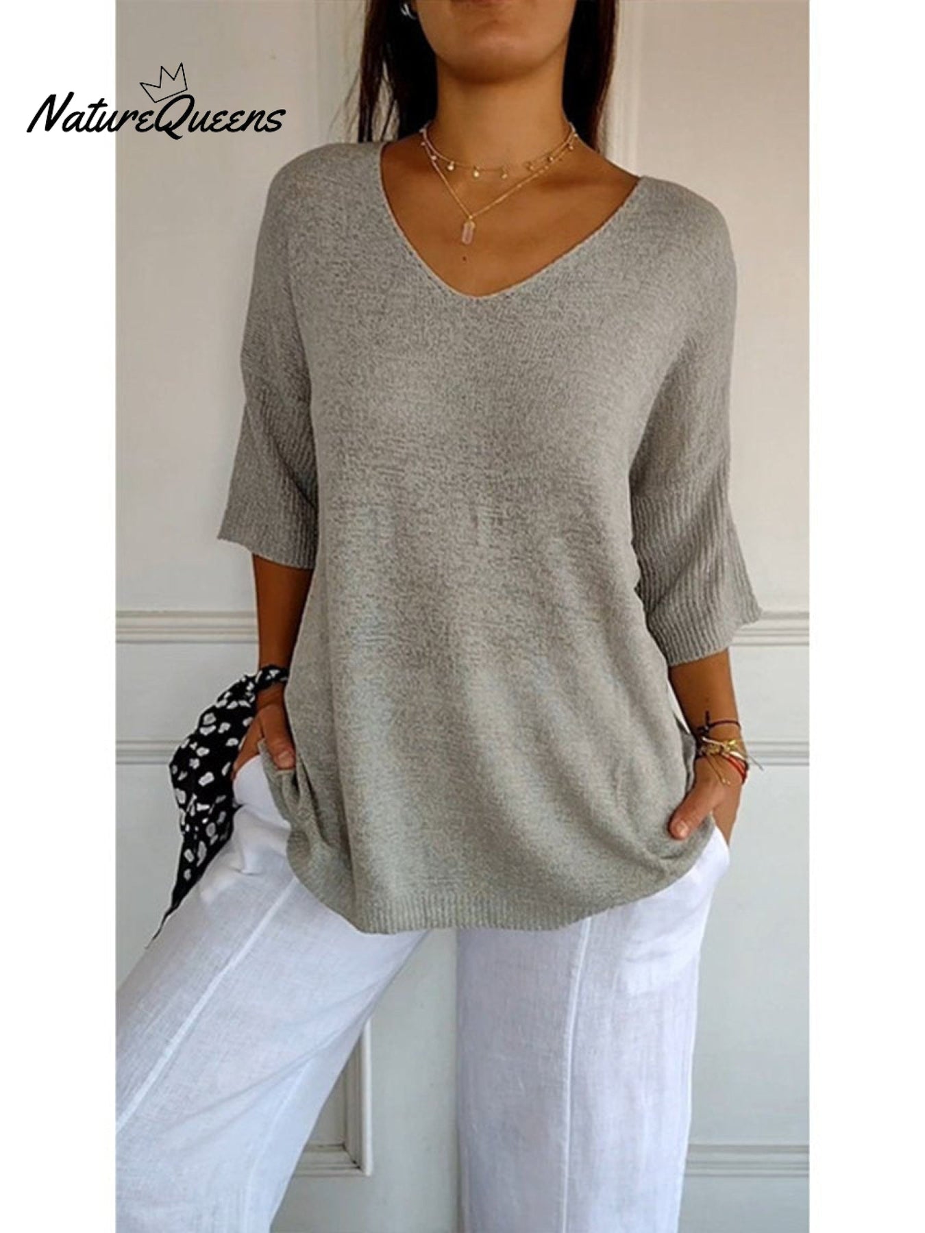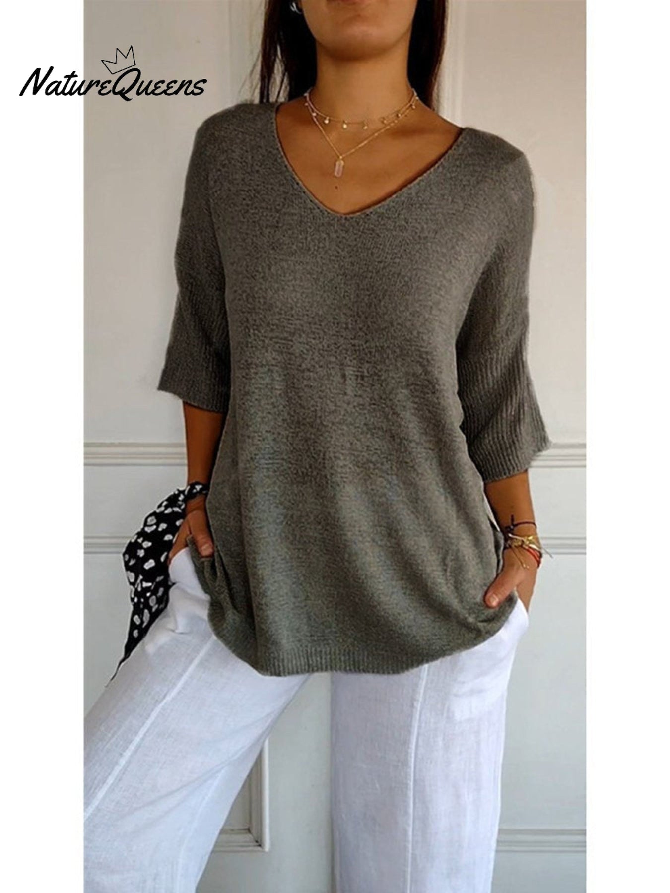 Damen Pullover mit 3/4-Ärmeln in einfarbigem Strick und V-Ausschnitt