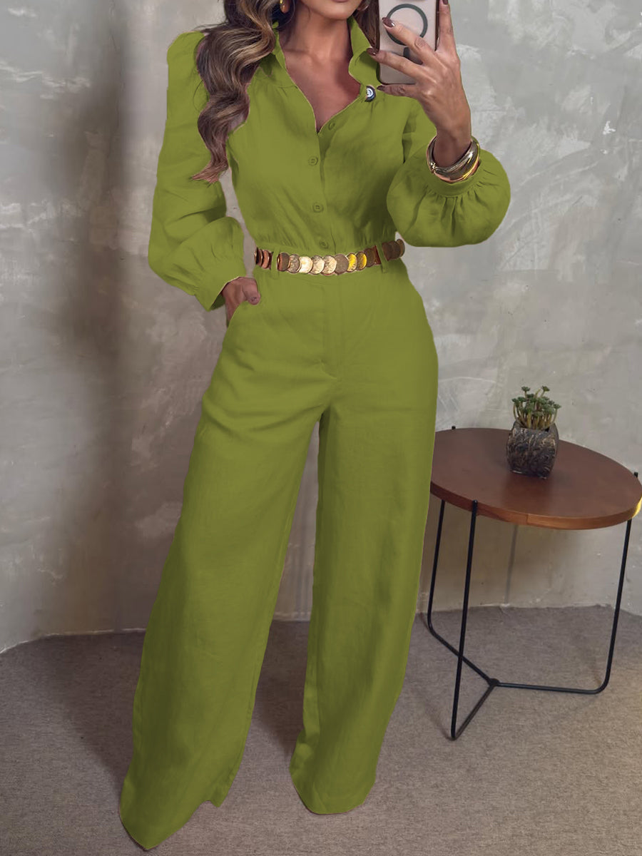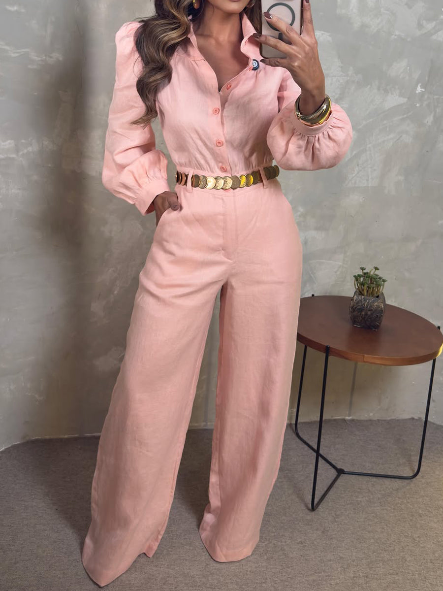Damen Leinen- und Baumwoll-Overall mit langen Ärmeln und Knopftaschen