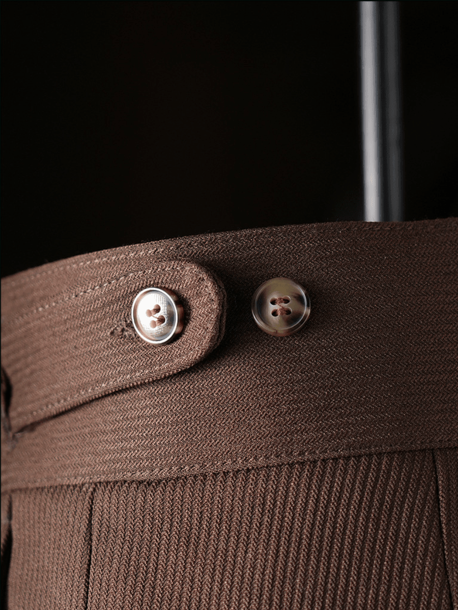 Erweitern Sie Ihre Garderobe mit diesen eleganten Anzughosen für Männer im Neapel-Stil von Ruisen Clothing. Hergestellt aus einer bequemen Leinenmischung bieten diese hochtaillierten, gerade geschnittenen Hosen eine Kombination aus Eleganz und Vielseitigkeit. Perfekt für legere und semi-formelle Anlässe, verfügen sie über ein zeitloses Design mit italienischen Knopfdetails, das einen stilvollen Look gewährleistet, der mühelos mit verschiedenen Outfits kombiniert werden kann. Erhältlich in klassischen Farben wie Schwarz, Dunkelbraun und Khaki, sind diese Hosen so konzipiert, dass sie den ganzen Tag über einen bequemen und stilvollen Sitz bieten.