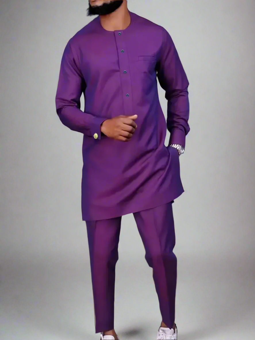 Fühlen Sie sich wie royalty in unserem Plus Size Afrikanischen Einfachen Lila Langarm Herren Set! Mit seiner lebhaften Farbe und bequemen Passform werden Sie stilvoll auffallen. Perfekt für jeden Anlass, ist dieses Set sowohl auffällig als auch praktisch. Beherrschen Sie das Mode-Spiel mit diesem einzigartigen und modischen Ensemble.